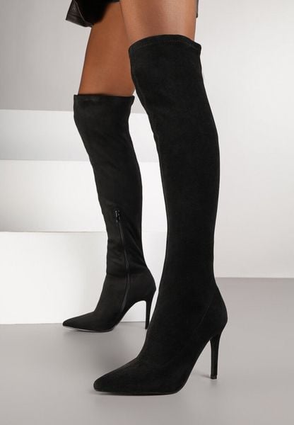 Czarne Marszczone Kozaki Vices z Imitacji Zamszu na Szpilce z Noskiem w Szpic Caldissa