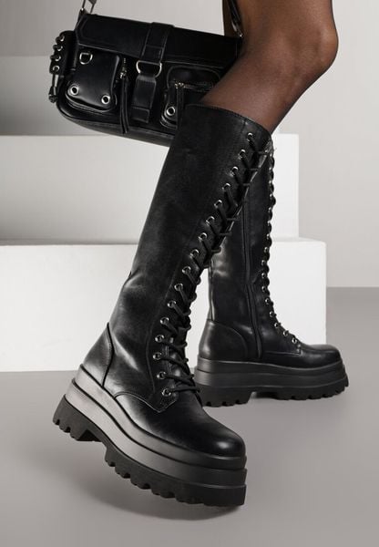Czarne Kozaki na Platformie w Stylu Grunge Ozdobione Sznurowaniem Wiolara