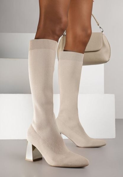 Ciemnobeżowe Kozaki Vices na Metalicznym Słupku ze Skarpetkową Cholewką Tivitte