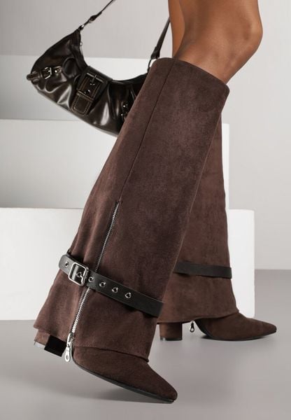 Brązowe Kozaki Typu Bikery Ozdobione Suwakiem Klamrą i Wywiniętą Cholewką Sovera