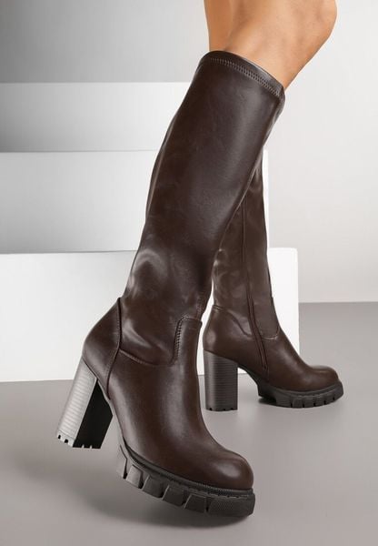 Brązowe Klasyczne Kozaki na Słupkowym Obcasie z Dopasowaną Cholewką Lattinea