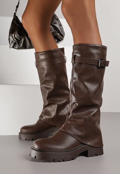 Ciemnobrązowe Marszczone Kozaki VICES z Wywiniętą Cholewką z Klamerką Talles