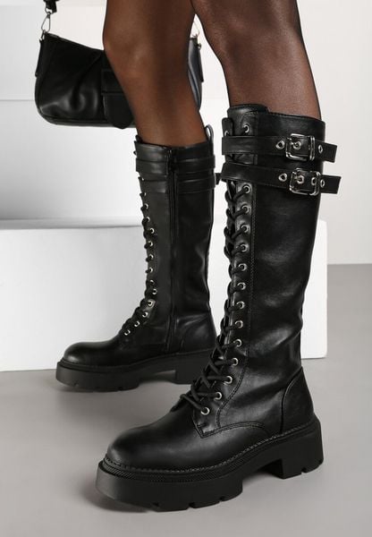 Czarne Sznurowane Kozaki na Platformie w Stylu Workerów z Paskami i Klamrami Asintoria