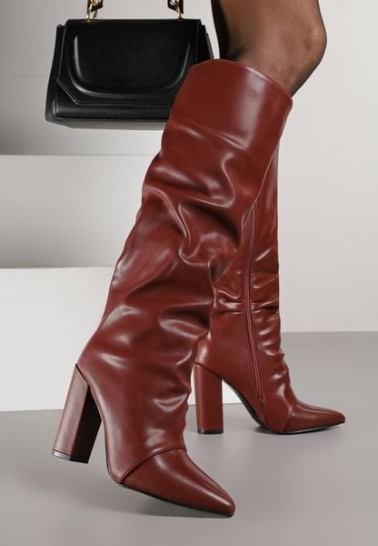 Bordowe Marszczone Kozaki na Słupkowym Obcasie z Noskiem w Szpic Badara