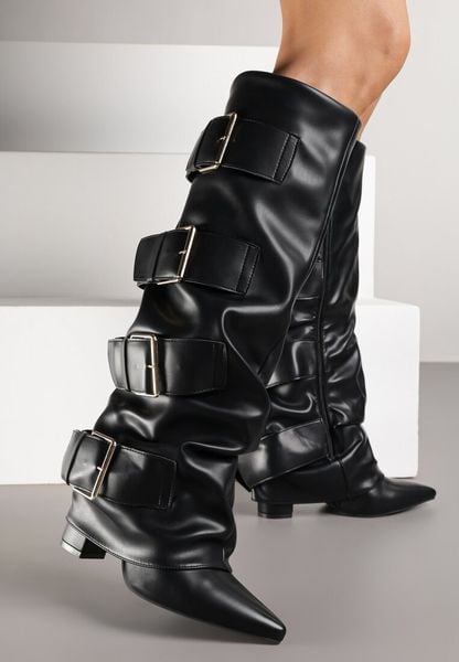 Czarne Kozaki na Słupku z Wywiniętą Cholewką i Klamrami Arullia