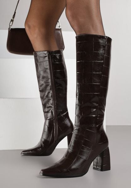 Brązowe Kozaki na Słupku z Noskiem w Szpic i Geometrycznym Tłoczeniem Saliatea