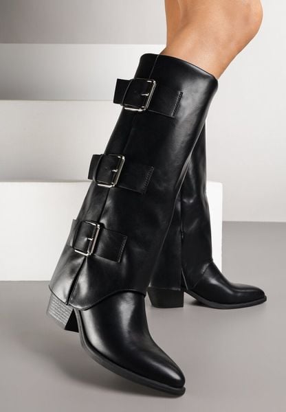 Czarne Kozaki na Obcasie w Rockowym Stylu z Wywiniętą Cholewką Ozdobione Klamrami Navala