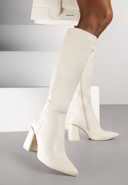 Beżowe Kozaki na Słupku z Metalicznym Zdobieniem i Szpiczastym Noskiem Nisfitta