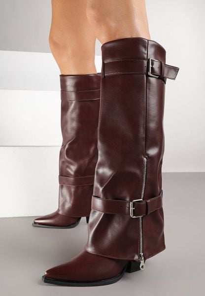 Bordowe Kozaki na Stożkowym Obcasie z Wywiniętą Cholewką Klamrami i Suwakiem Ernenta