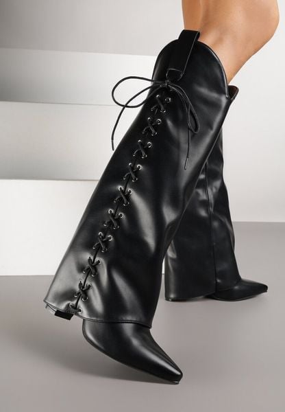 Czarne Kozaki na Słupku Ozdobione Sznurowaniem i Wywiniętą Cholewką Latanessa