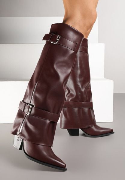 Bordowe Kozaki na Stożku z Cholewką Imitującą Nogawkę z Klamrami i Suwakiem Erseria