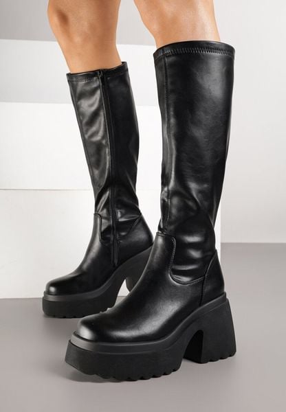 Czarne Kozaki na Obcasie i Platformie za Kolano z Dopasowaną Cholewką Feniefra