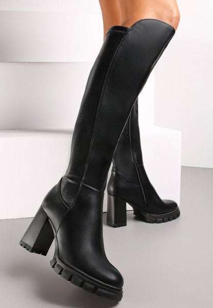 Czarne Dopasowane Kozaki za Kolano na Słupku z Niską Platformą Jonvale