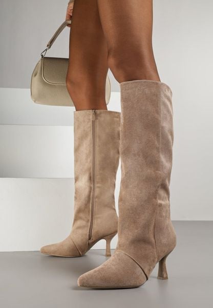 Ciemnobeżowe Kozaki z Imitacji Zamszu na Szpilce z Marszczoną Cholewką Rilareia