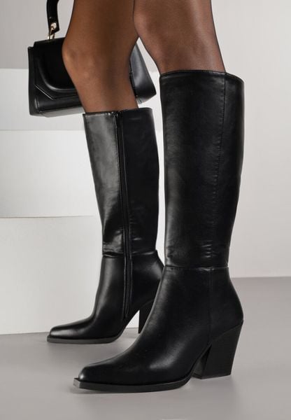 Czarne Eleganckie Kozaki do Kolana na Stożkowym Obcasie z Noskiem w Szpic Seolina