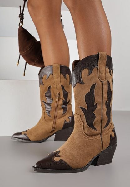 Brązowe Kozaki Kowbojki na Stożku z Tłoczoną Cholewką Avrenne