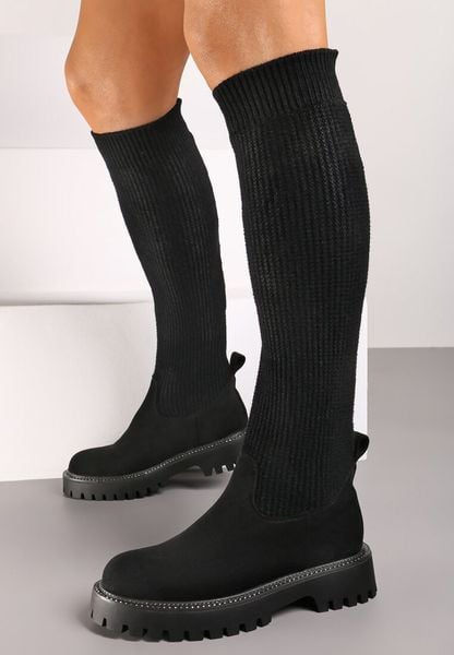 Czarne Kozaki na Platformie ze Skarpetową Cholewką Ozdobione Cyrkoniami Lerivara