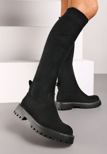 Czarne Kozaki na Grubej Podeszwie z Elastyczną Cholewką i Cyrkoniami Lerivelle