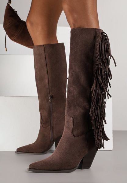 Ciemnobrązowe Kozaki Kowbojki na Stożku z Imitacji Zamszu Zdobione Frędzlami Rabella