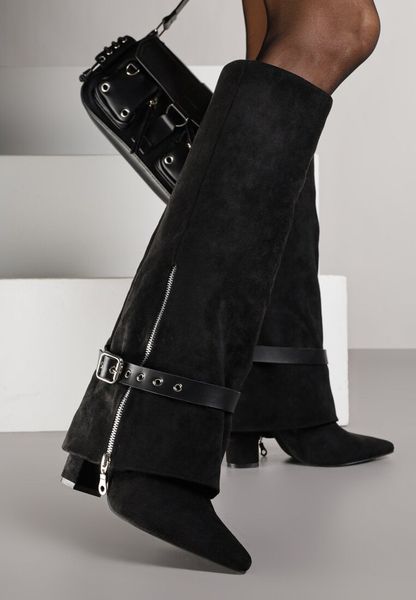 Czarne Kozaki na Słupku Ozdobione Klamrą i Wywiniętą Cholewką z Tłoczeniem Latelia