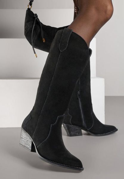 Czarne Zamszowe Kozaki Kowbojki na Stożkowym Obcasie Sevra