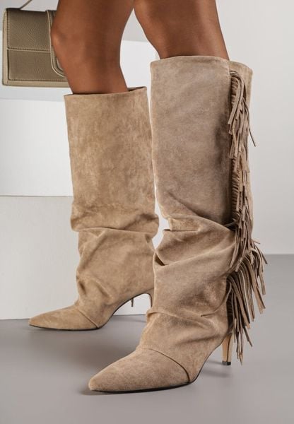Ciemnobeżowe Kozaki z Imitacji Zamszu na Szpilce z Marszczoną Cholewką z Frędzlami Linotris