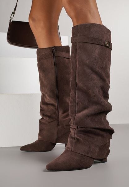 Brązowe Marszczone Kozaki na Słupkowym Obcasie z Wywiniętą Cholewką Runella