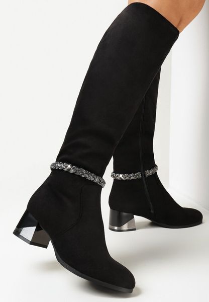 Kozaki Brebora na niewysokim słupku z metaliczną wstawką. Cholewka sięgająca przed kolano. Nad kostką ozdobny warkocz z cyrkonii. Lekko ocieplone kocem obuwniczym.