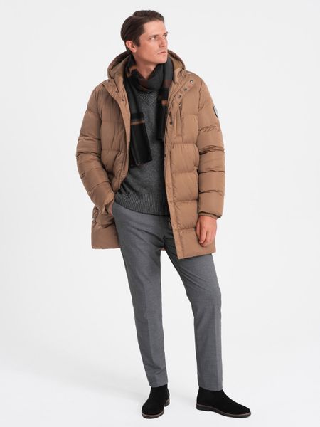 Długa zimowa kurtka męska pikowana o satynowym wykończeniu – jasnobrązowa V2 – Rozmiar: L