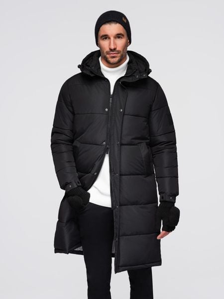 Długa męska kurtka zimowa pikowana z kapturem - czarna V1 - Rozmiar: XXL