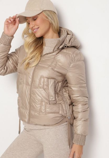 Ciemnobeżowa Pikowana Kurtka z Materiałowym Kapturem i Kieszeniami Ravalynne