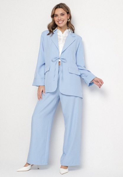 Niebieski Komplet Szerokie Spodnie i Marynarka z Wiązaniem Novazelle