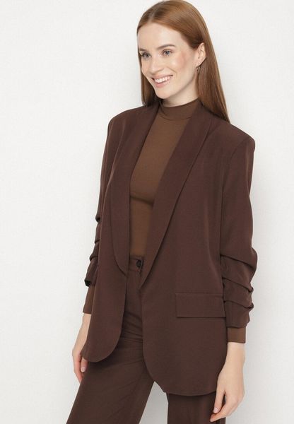 Brązowa Pudełkowa Marynarka Bez Zapięć z Wiskozą z Marszczonymi Rękawami Fenidia