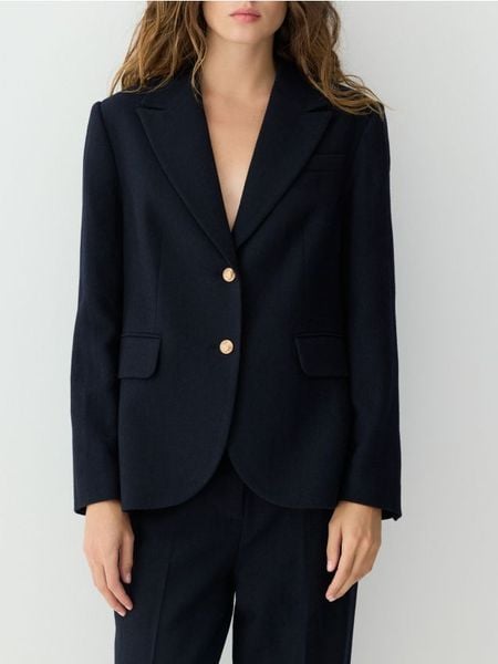 Marynarka o prostym kroju, wykonana z tkaniny z wełną.