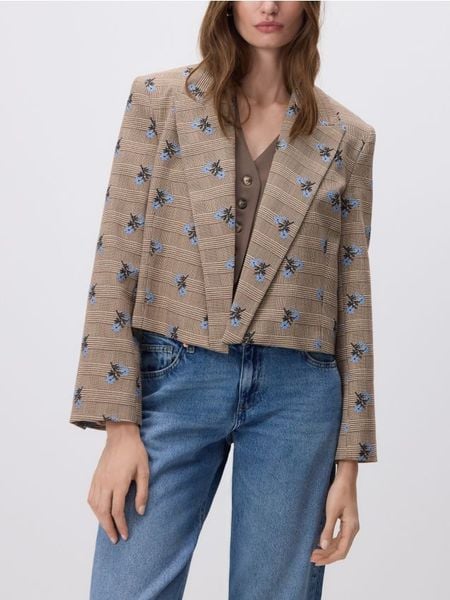 Marynarka o krótszym kroju, wykonana z tkaniny z dodatkiem wiskozy.