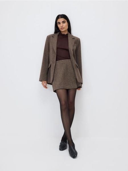Marynarka o prostym kroju, wykonana z tkaniny z wełną.