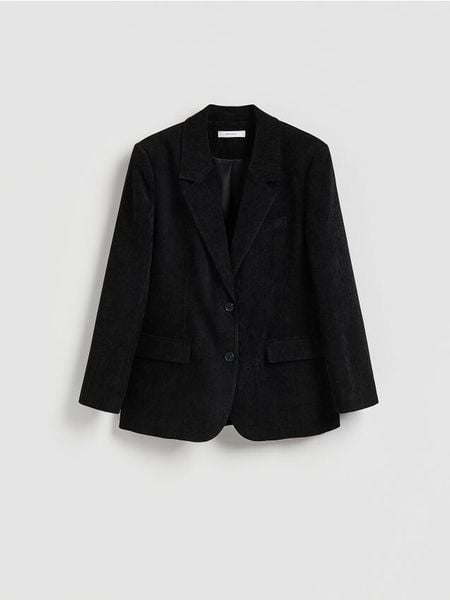 Marynarka o prostym kroju, wykonana z tkaniny.
