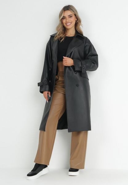 Płaszcz Isatia z imitacji skóry. Model dwurzędowy z paskiem z tego samego materiału. Na wysokości bioder kieszenie z klapami. Przy rękawach paski z guzikami. Świetnie sprawdzi się w sezonie wiosennym i jesiennym.