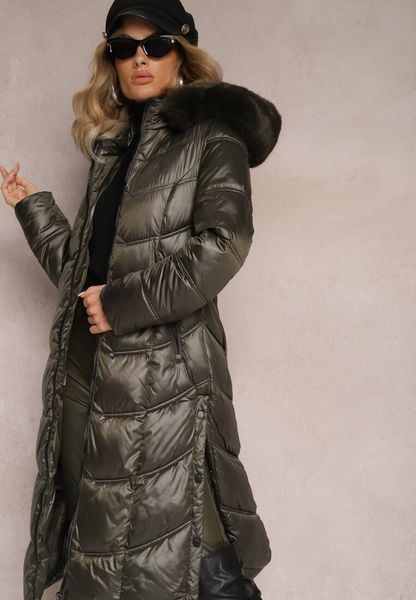 Ciemnozielona Pikowana Kurtka Płaszcz za Kolano z Kapturem i Futerkiem Naelora