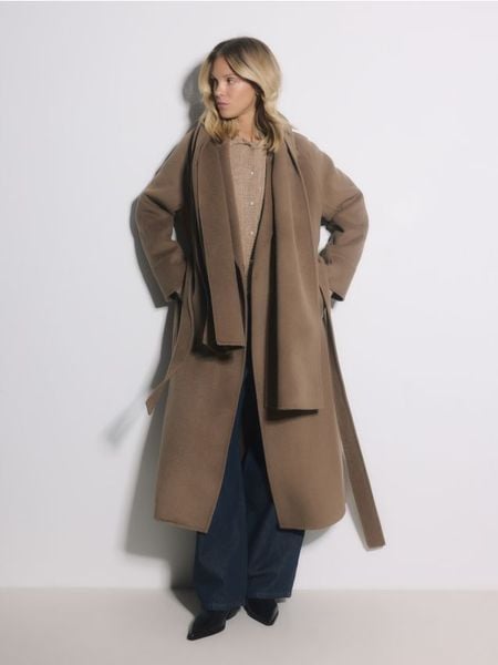 Płaszcz o swobodnym kroju, wykonany z tkaniny z wełną.