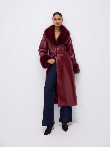 Jednorzędowy płaszcz o prostym fasonie, wykonany z imitacji skóry.