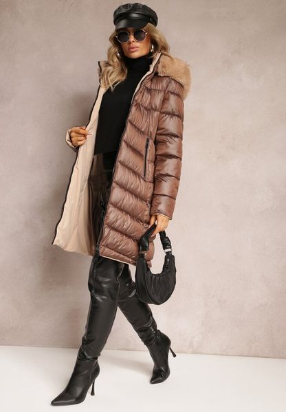 Brązowa Dwustronna Kurtka Płaszcz z Klasycznym Pikowaniem i Kapturem z Futerkiem Nuncos