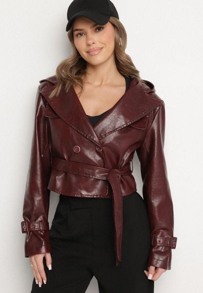 Bordowa Krótka Kurtka Typu Trencz z Imitacji Skóry z Kapturem i Wiązanym Paskiem Nilianiela