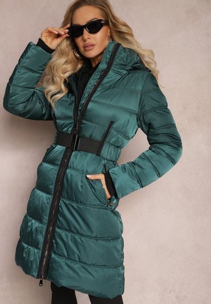 Zielona Kurtka Płaszcz z Poziomym Pikowaniem i Paskiem w Talii Nondra