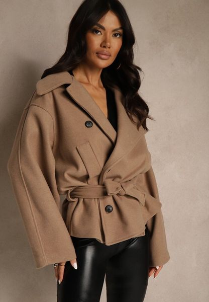 Beżowy Pudełkowy Krótki Płaszcz z Wiskozą z Wiązanym Paskiem i Kołnierzykiem Tusainea