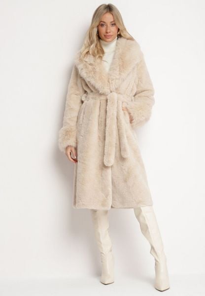 Beżowy Futerkowy Płaszcz z Szerokim Kołnierzem i Mankietami z Wiązanym Paskiem Viaruna