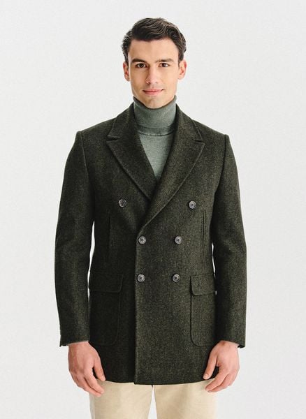 Zielony płaszcz wełniany – Pako Lorente. Ciemnozielony płaszcz na jesień. Skład: 100% wełna. Podszewka: 55% poliester, 45% wiskoza. Zapinany płaszcz w jodełkę. PREMIUM.