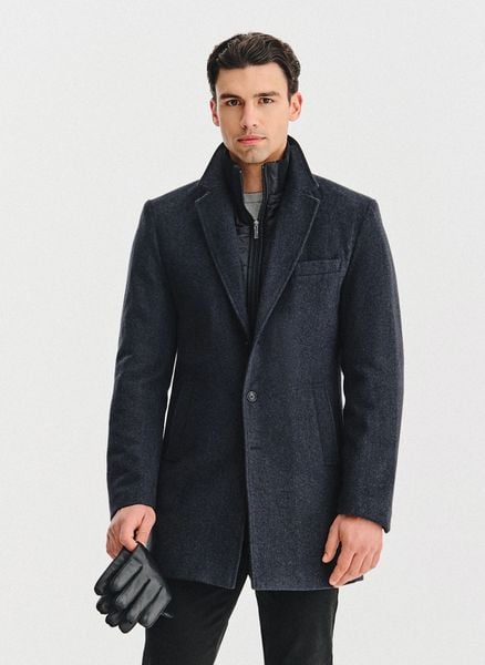 Grafitowy płaszcz męski – Pako Lorente. Ciemny płaszcz na jesień. Skład: 60% wełna, 35% poliester, 5% inne. Podszewka: 100% poliester. Wypełnienie: 100% poliester. Płaszcz z odpinanym kołnierzem. Płaszcze welniany.