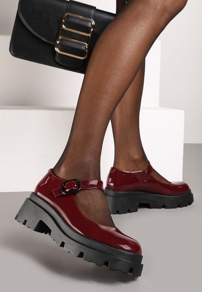 Bordowe Półbuty Lakierowane na Platformie i Obcasie w Stylu Mary Jane ze Skórzaną Wkładką Asforia