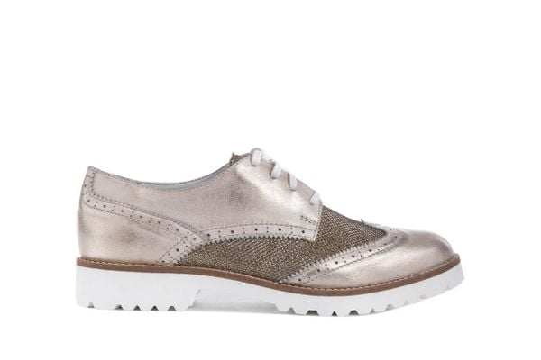 Złote połyskujące półbuty marki Bayla. Grubsza biała podeszwa o strukturze trapera. Noski ‚wingtip’ w kształcie skrzydeł wraz z bocznymi dziurkowaniami i ząbkowanymi krawędziami podkreślają piękno butów.- wykonane ze skóry naturalnej- wstawki błyszczącej tkaniny podszytej skórą- sznurowane z przodu- skórzana wyściółka- precyzyjnie wykonane- cieniowane cholewki- miękka wkładka